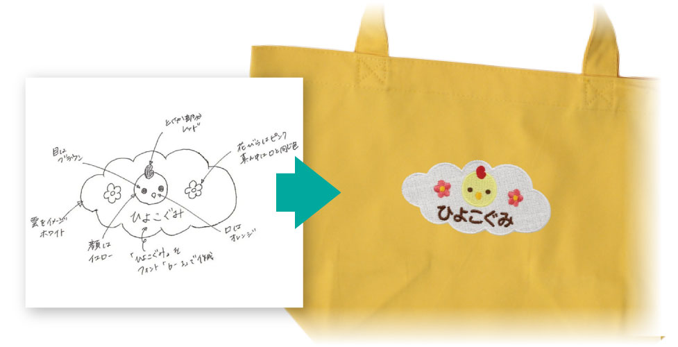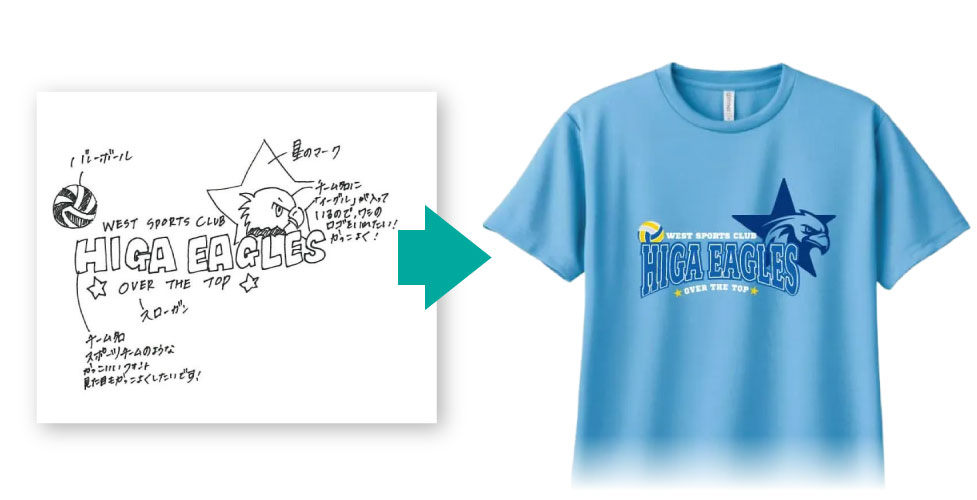 デザインのイメージはあるけれど、それを綺麗に手描きしたり、ソフトやアプリで作ったりする自信がないという方でも大丈夫です。ご注文いただくお客様であれば、料金不要で手描きの原稿からデザインイメージを作成いたします。