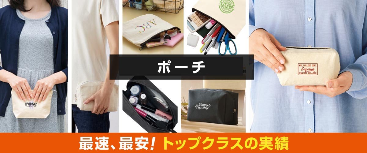 オリジナルポーチを激安でプリント・作製ならCLAT-JAPANへ! 化粧道具や小物などの持ち運びに便利なポーチ類。オリジナルロゴ印刷や、名入れプリントで販促グッズやノベルティにも大人気。オーダーメイドで1個から小ロットの制作もおまかせください。
