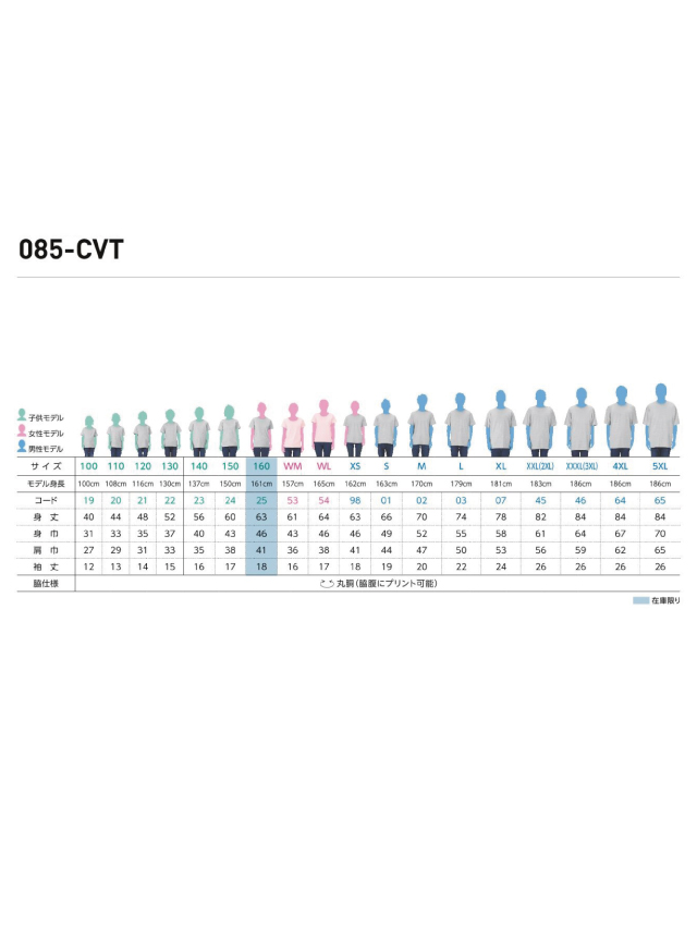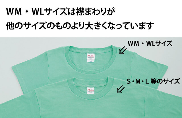 XXLは+200円、XXXLは+300円別途料金がかかります。100~130脇プリント不可になります。WMとWLサイズは襟ぐりが広めになります。