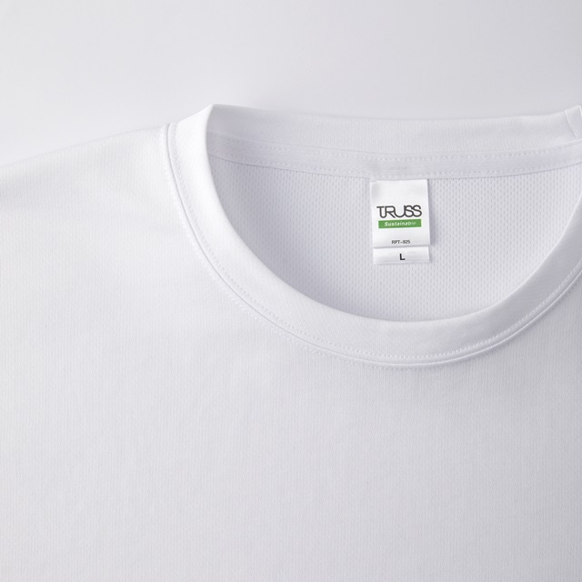 RPT-925 | TRUSS2枚の生地を重ねて作られた、ダブルフェイスの吸水性に優れた再生ポリエステルを使用したTシャツ。世界的なスポーツメーカーの品質基準を満たした染色堅牢度で、いつまでもきれいな色合いを保ちます。裏地にはしっかりとした、肌触りの良いメッシュ生地を採用し汗もしっかり吸収。スポーツなどの身体を動かすシーンにもぴったりです。プリントもきれいに映える1枚です。