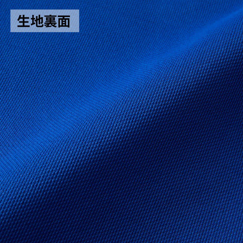 ポリエステル鹿の子を使用した、さっぱりとしたドライタッチの生地。表地は上品な光沢となめらかな風合いで肌ざわりも良く、汗冷えしにくいので快適なウェアで最高のパフォーマンスを実現。ホワイトの生地には透け感を軽減させるため特殊な糸を使用。そして、シワが付きにくく、乾きやすい、繰り返し洗っても色落ちしにくいイージーケアが何よりも魅力。