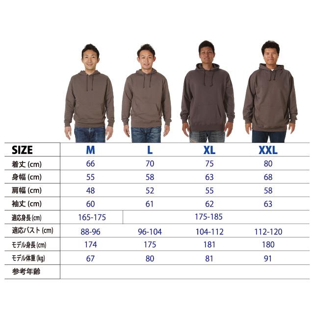 XXLは+500円、XXXLは+720円別途料金がかかります。110~150はフードひも無し。※ライトピンク・オレンジ・ゴールド・サンドカーキ・配色カラーはSサイズ以上のサイズ展開です。XXXLはブラック、ミックスグレー、ネイビーのみ。