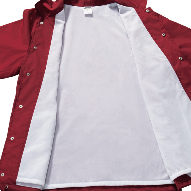 077CJ | Printstarスタンダードなタイプのコーチジャケットです。シンプルな見た目ですが袖口はゴム入りでしっかりフィットし、裾は紐入りで縛ることが出来るので暖気を逃がしません。裏地はつるりとしたトリコットで着やすく、利便性がしっかりと考えられています。イベント物販用やスポーツチームのお揃いジャンパーとしても人気です。