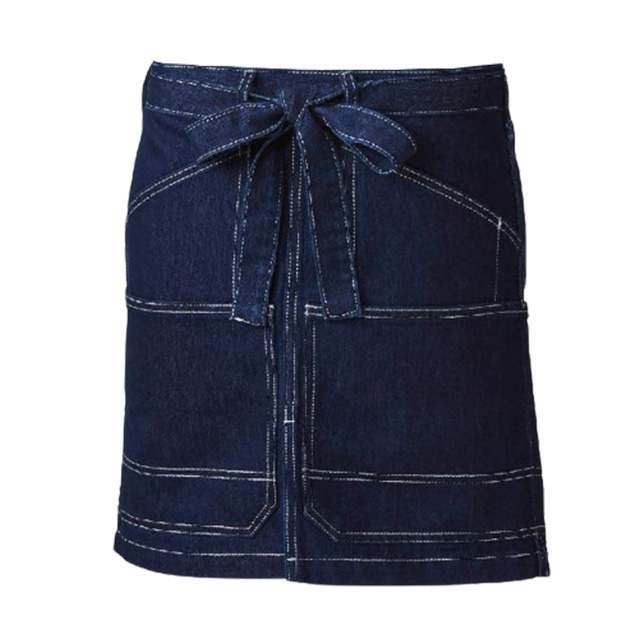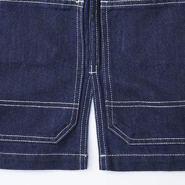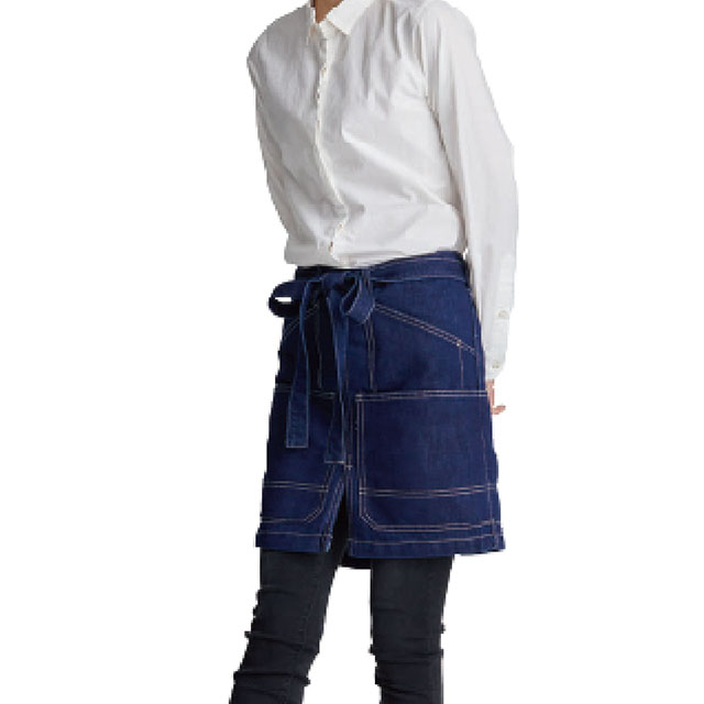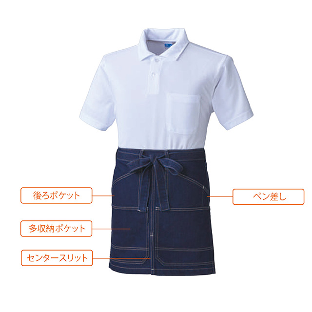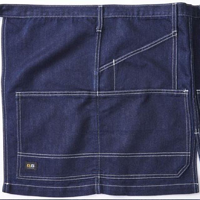 10110 | SOWAデニム生地でもゴワゴワ感が無く、肌触りがいい生地です。また、ポリエステルを使っているのでシワが入りにくいのも魅力の1つ。作りがしっかりしているので、飲食店やDIYなどのヘビーユーズにも応えてくれるショートエプロンです。あると便利なペン差しの他、ポケットが6つも付いているので、収納力はバツグン。動きにくさを軽減するセンタースリットもポイントです。