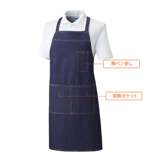 10022 | SOWA綿100%デニム素材のエプロンです。デニムのジーンズと同じように、使えば使うほど味が出て馴染む素材です。丈夫なデニム素材なので引き裂きや摩耗に強く、抜群の強度と耐久性があります。吸汗性にも優れており、いつでも快適に過ごせます。飲食店や工場など場所を選ばず、様々なシチュエーションでご使用できます。背中で紐を交差して結ぶ「たすき掛けタイプ」になっています。