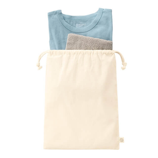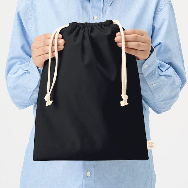 TR-1285 | MARKLESS STYLEオーガニックコットン素材を使用したマチなしのすっきりとしたデザインの巾着Lサイズです。LサイズはTシャツやタオルなどの衣類も入れられるサイズ感なので、部活動の練習着、旅行バックの洗面用具などの仕分けにも便利です。ショップのオリジナル商品や購入特典・イベントのノベルティグッズなどにもおすすめです。