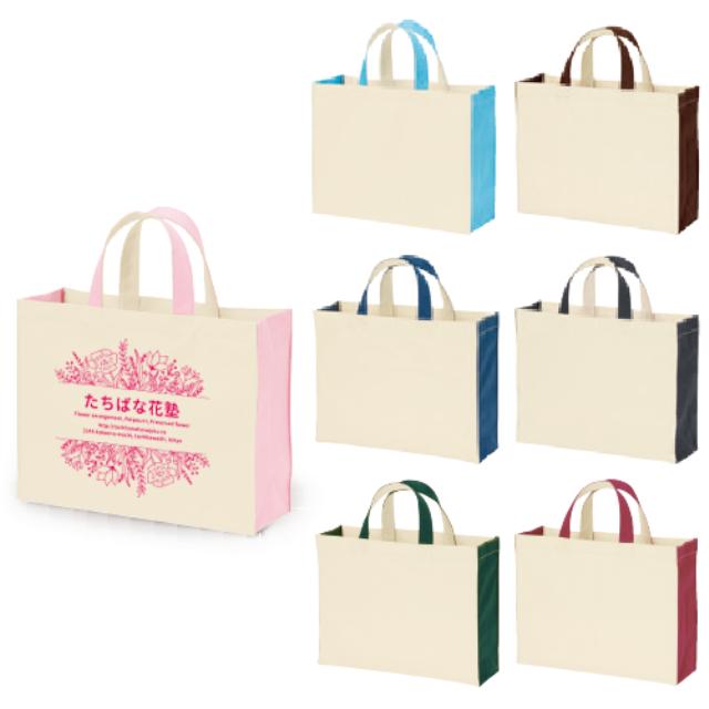TR-0765 | MARKLESS STYLEノベルティとして、学校用としても最適な厚みのあるA4書類も収納可能なトートバックです。7色のお色をご用意しているので、プリントするデザインが同じでもバッグの色を変えて季節感を演出する事も可能です。学校なら学年やグループごとに分けるという活用方法も。枚数をまとめてご注文頂くと1枚あたりの金額もお安くなり、もし足りなくなった場合でも、ご注文後1週間以内に必要枚数を発送出来ます。