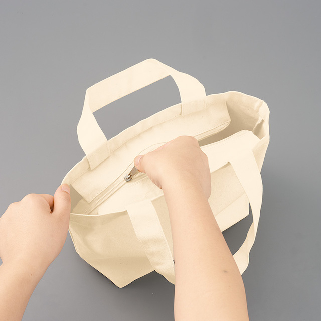 TR-1286 | MARKLESS STYLE厚みのあるしっかりとした生地で、ベロ付きファスナーと底にはマチがある定番トートバッグSサイズです。お財布と携帯、ポーチにペットボトルなど、ちょっとしたお出かけ時の荷物を入れるのにぴったりのサイズ感です。会社やショップのロゴを入れたノベルティグッズや、アーティストの物販品としてもおすすめのアイテムです。