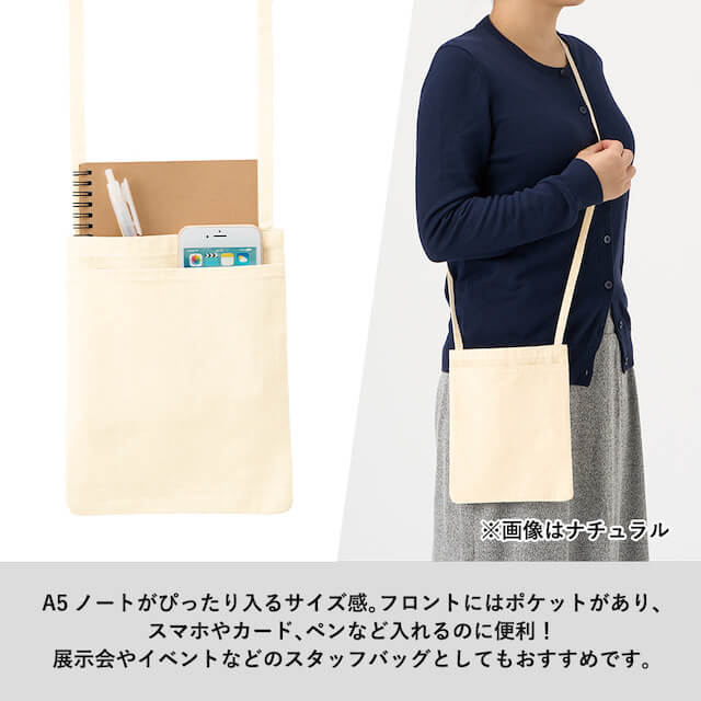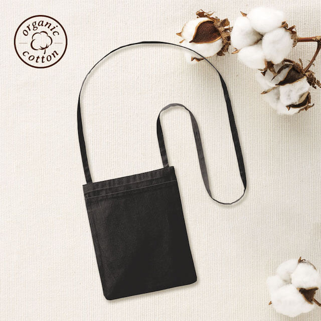 TR-1299 | MARKLESS STYLEオーガニックコットンを使用したポケット付きのサコッシュです。農薬不使用で環境に優しく、程よい厚みの生地で中身が透けにくいのも特徴。A5ノートがぴったり入るサイズ感で、手前にはポケットがついているのでスマホやカード、ペンなどを入れるのに便利です。ノベルティとしてはもちろん、ライブやイベントオリジナルグッズなどの物販品としてもおすすめの商品です。