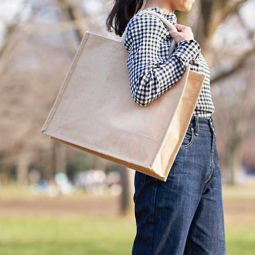 TR-1006 | MARKLESS STYLE人気のジュートバッグ。地球にやさしい天然素材を使用しているので、販促品としてはもちろん、オーガニックコスメや食料品店などのパッケージとしてもおすすめです。たっぷり入る大きめのトートなので、お買い物やアウトドアなどの荷物が多い外出時に最適。ざっくりしたナチュラルな素材感は、バッグとしてだけでなく、インテリアとしてもおしゃれです。