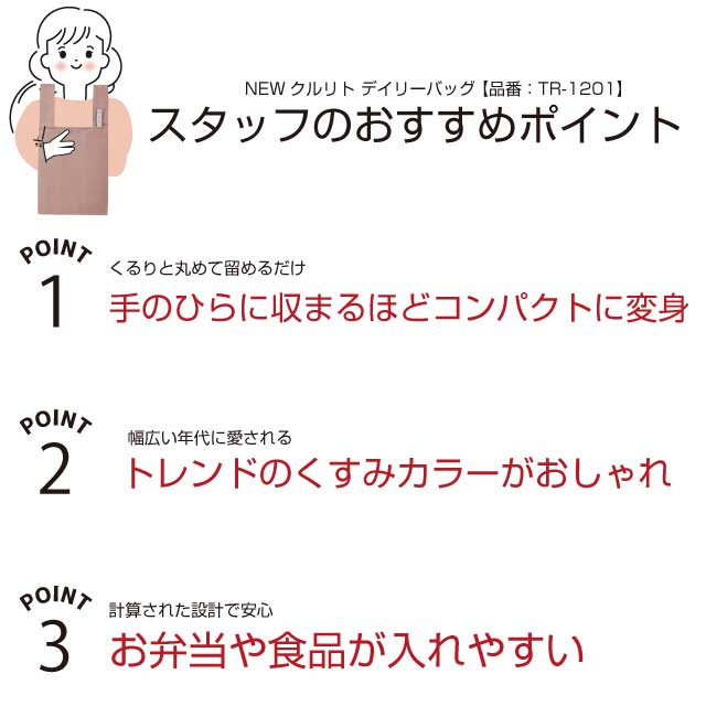 TR-1201 | MARKLESS STYLEくるりと丸めてゴムバンドでとめると、手のひらに収まるほどのコンパクトサイズで持ち運べるエコバッグです。 バッグの容量も十分で、お弁当が入れやすい計算されたフォルムとなっており、ランチタイムの持ち歩きや、お買いものバッグとしても使いやすいサイズです。性別、年齢問わず誰からでも受け入れられるシンプルなデザインに、トレンドのくすみカラーの本体がおしゃれなエコバッグです。シワになりにくくて洗えるこだわりの軽量高密集ポリエステル生地を使用しておりますので、とても軽く丈夫な仕上がりです。カバンにひとつ入れて持ち歩きたいバッグです。