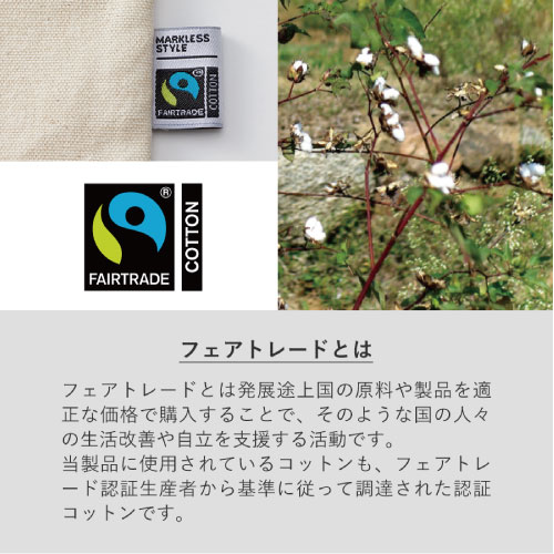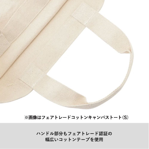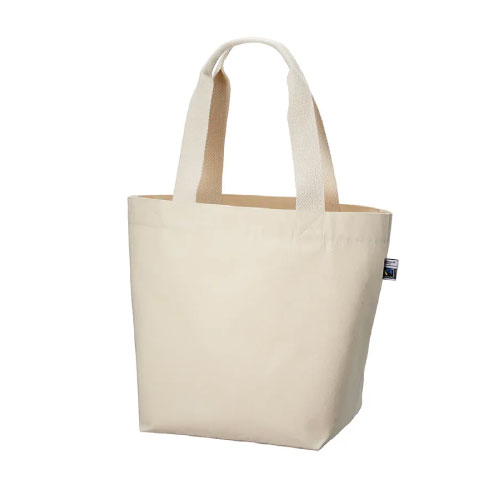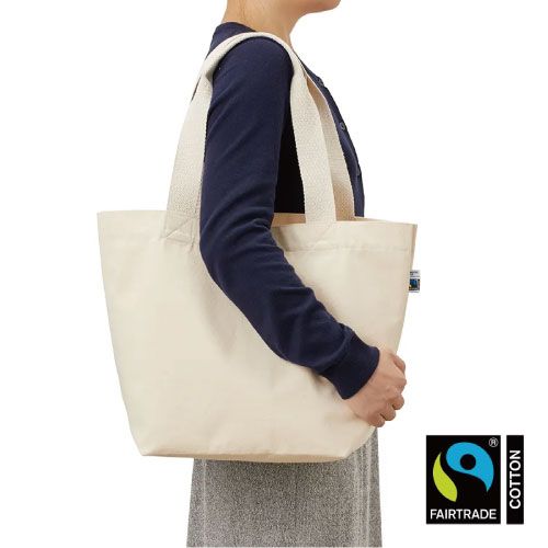 TF-0004 | MARKLESS STYLE生地、紐、全ての素材にフェアトレード認証のオーガニックコットンを使用したバッグです。優しい風合いが引き立つナチュラルカラーが魅力的。持ち手部分は二つ折り縫製のため、手で持ったり、肩掛けした際にも負担がかかりにくい仕様になっております。広めのマチ付きですので、重い荷物も安心して持ち運びできるのは、このバッグならでは。日常使いには勿論、どんなシーンでも活躍できること間違いなしでしょう。国際フェアトレード認証コットンラベルがあるので、企業様のSDGs活動やイメージアップにもご活用いただけます。