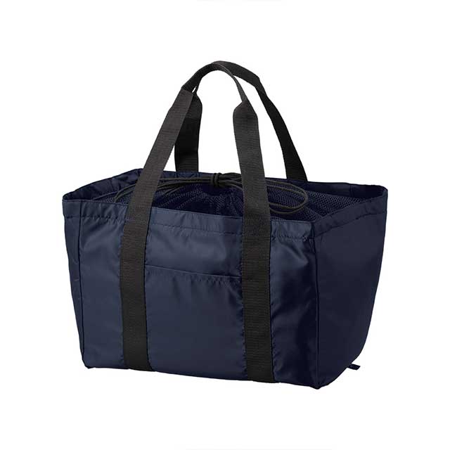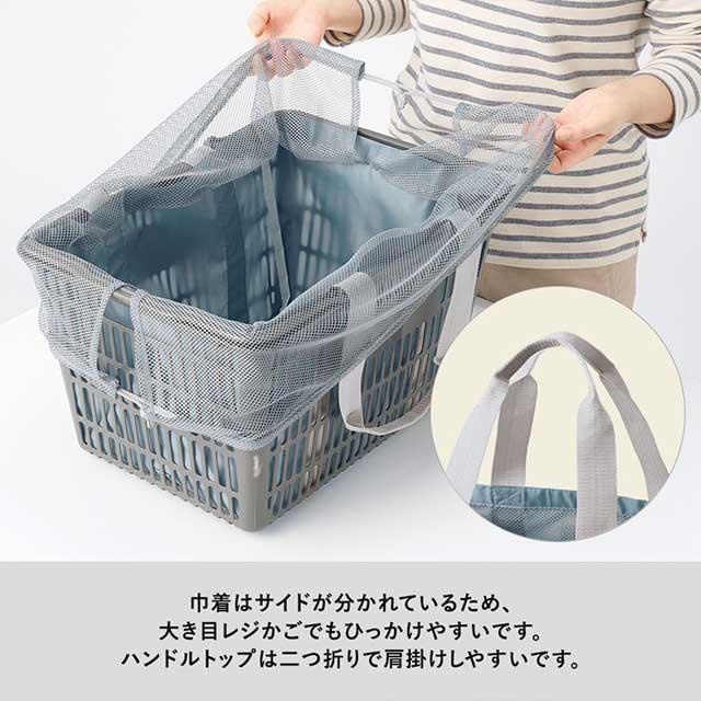 TR-1355 | MARKLESS STYLE軽くて持ち運びしやすいポケッタブル仕様のレジカゴトートです。 大容量ながら、底ホックで小さくまとめることのできるポケッタブル仕様で持ち歩きにも便利です。 巾着のサイド部分は切れ目が入っており、大きめのレジカゴにも引っ掛けやすいので 様々なサイズのレジカゴに対応できます。 口元巾着はメッシュになっているので、中身を確認しやすいのもポイントです。 またフロントポケット付きなので、小物を入れて荷物と分けておくことができます。 お店の購入特典や高級ノベルティはもちろん物販品としてもおすすめです。
